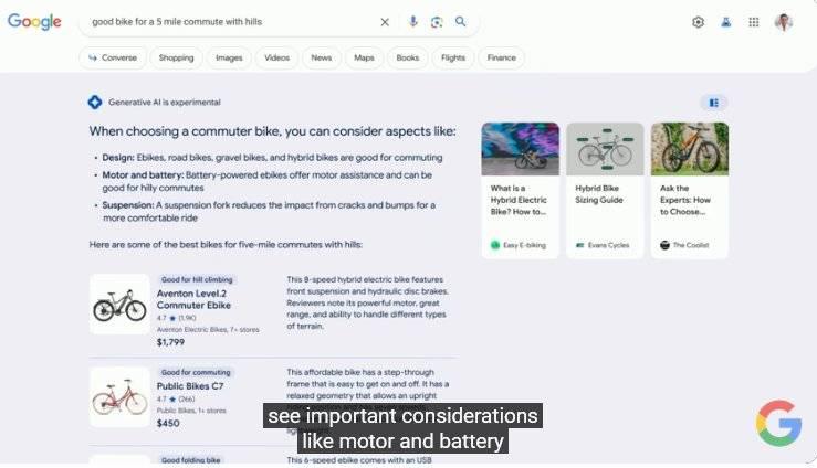 想要搜索商品的时候,AI 同样会发挥作用,在搜索框键入 " 有上下坡的五英里通勤自行车 ",搜索引擎会在上方给出选购自行车的思路建议,并给出若干商品推荐。