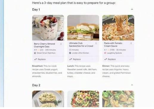 多步推理 Multi-step reasoning则可以用来做计划。当用户在搜索框键入 " 附近最好的瑜伽馆 " 时,AI 摘要会将附近瑜伽馆依照评分、课程、距离等信息分类成块,更清晰地展示给用户。Planning in Search 则允许用户直接用谷歌搜索做计划,如在搜索框中键入饮食计划的需求,搜索引擎会给你自动生成一份。