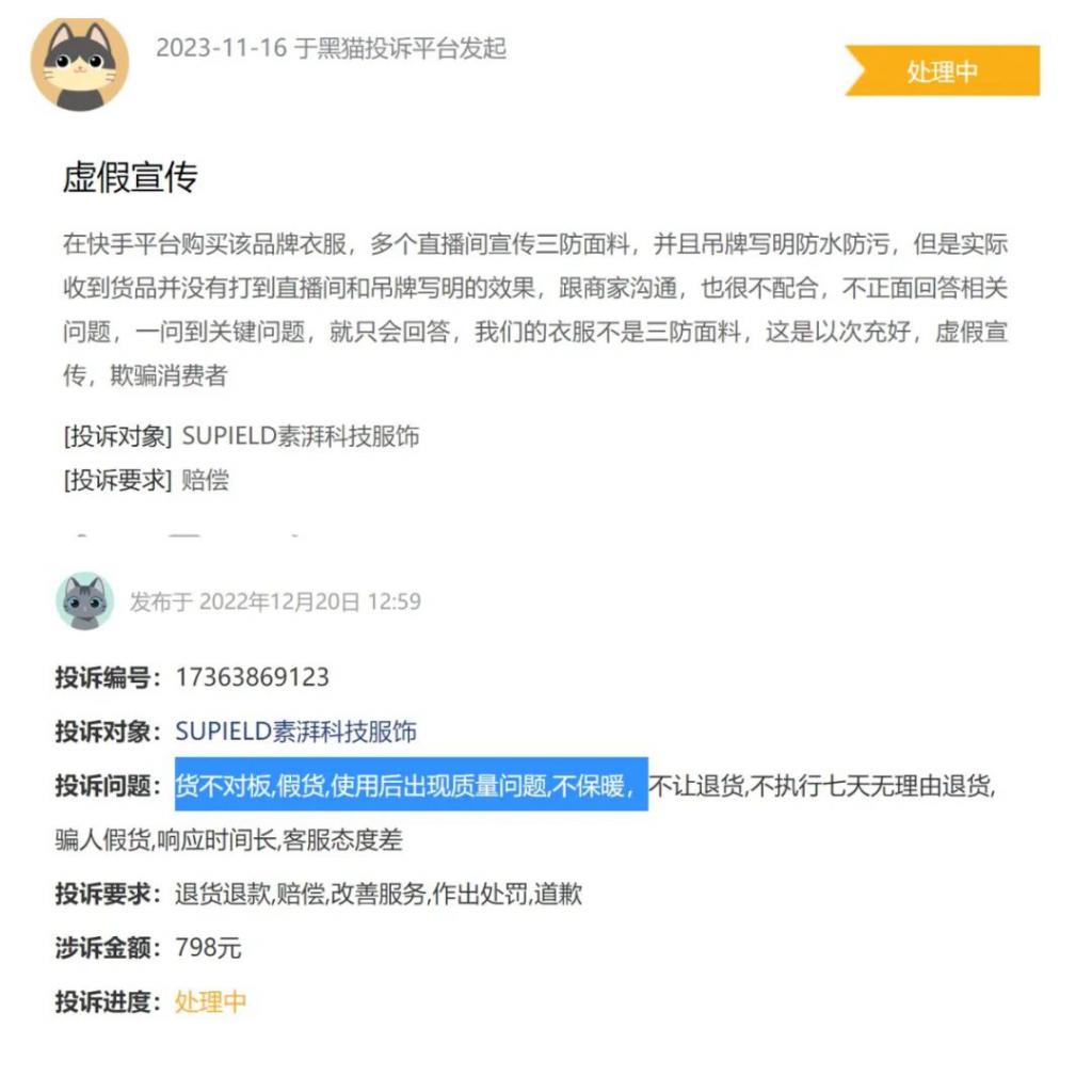 然而,在黑猫投诉平台,搜索与素湃相关的内容,投诉其产品虚假宣传、以次充好、货不对板的内容,比比皆是。