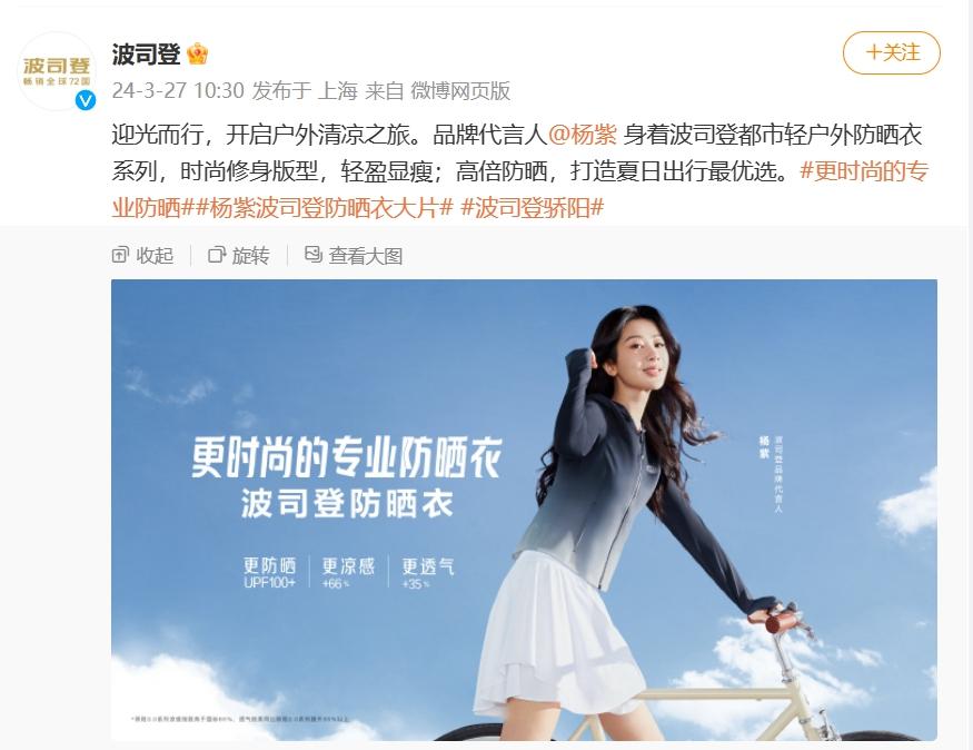 除了平台投放,波司登还签约艺人杨紫成为其防晒衣系列代言人。