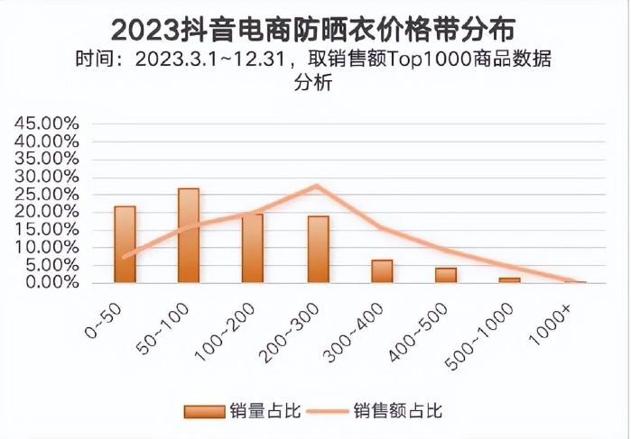 消费者也没有想象中的盲目,据有米云统计,2023 年 3 月到 12 月,抖音 0-50 元价位的产品占据平台防晒衣总体销售额的 21.6%,50-100 元的产品占比 26.8%。对防晒衣品牌的价格,消费者的接受度放宽到了 300 元以内。