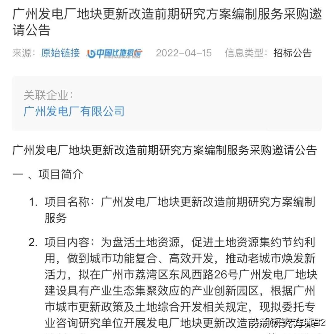 其次,2022年4月广州发电厂地块更新改造方案开始了招标工作。据悉,改造方案编制工作,最终由广州市城市规划勘查设计研究院中标。