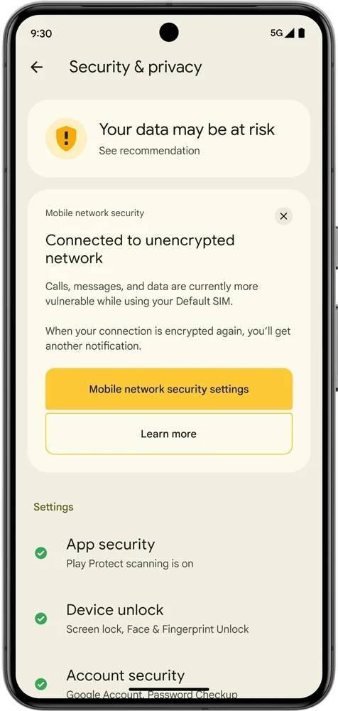 最后,谷歌正在推出通知,在连接到未加密的蜂窝网络时提醒用户以阻止 Stingray 攻击。