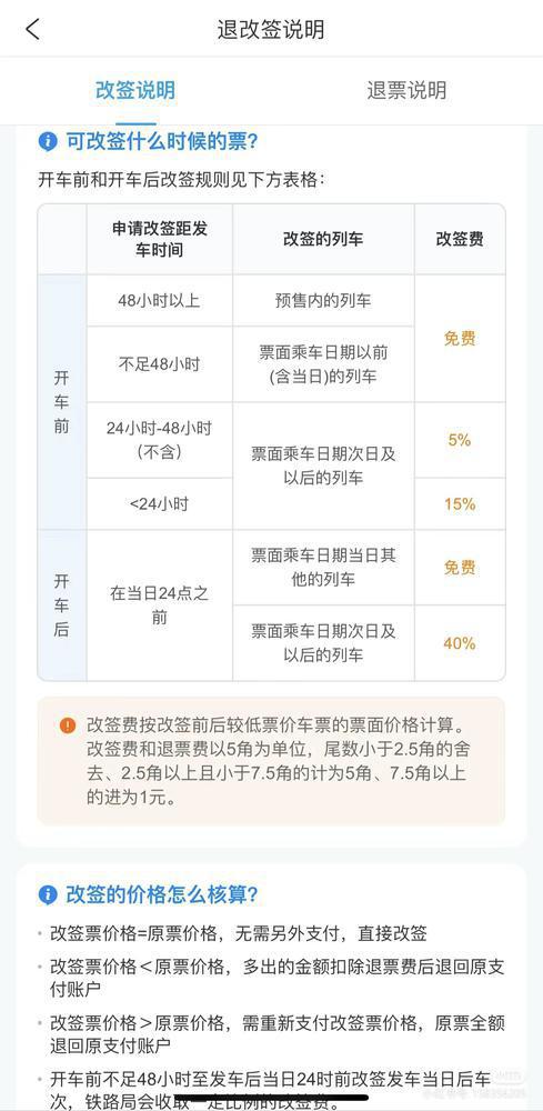 第一种是车没发出前,改签票是原车票日期往前或当日的全免费,哪怕晚于原车票发车时间,改签票是原车票日期的次日,开车前 48 小时前进行改签免费,之后按 5% 或 15% 阶梯收费。