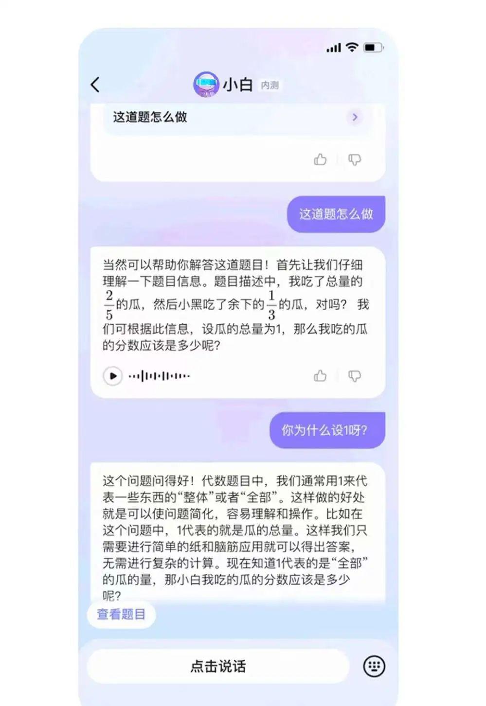 比如在海豚 AI 学 App 问 " 小白 ":"0.999 无限循环和 1 哪个大 "?小白先是询问了提问者对无限循环概念的理解,再将常见的分数 "1/3" 转化为小数,并引导提问者思考:由于 1/3 转换为小数是 0.333 无限循环,都乘以三后即可得出结论,两个数字一样大。