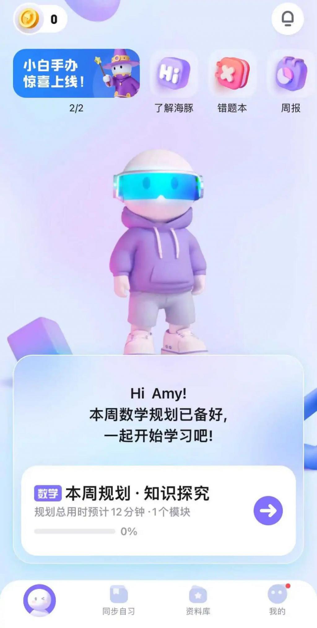 打开海豚 AI 学,可以看到,海豚 AI 学首页全新改版,"AI 小白 " 升级成为孩子的智能学伴,全程跟随孩子的学习进程,智能推荐个性化学习内容。此外,还提供鼓励式互动。