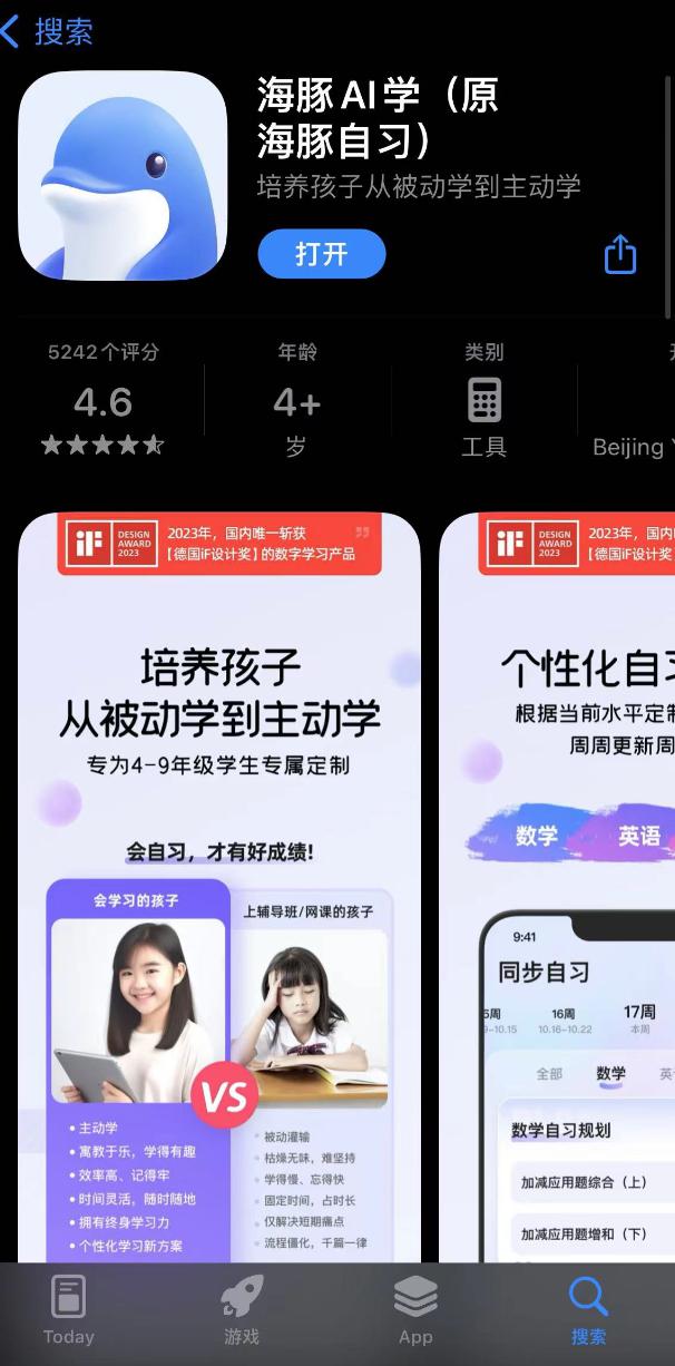 据了解,海豚 AI 学是一款针对家庭端孩子自主学习的工具类软件,其理念是 " 培养孩子从被动学到主动学 ",试图真正站在孩子的视角,提供更科学的个性化学习方案,让孩子学会学习、爱上学习。