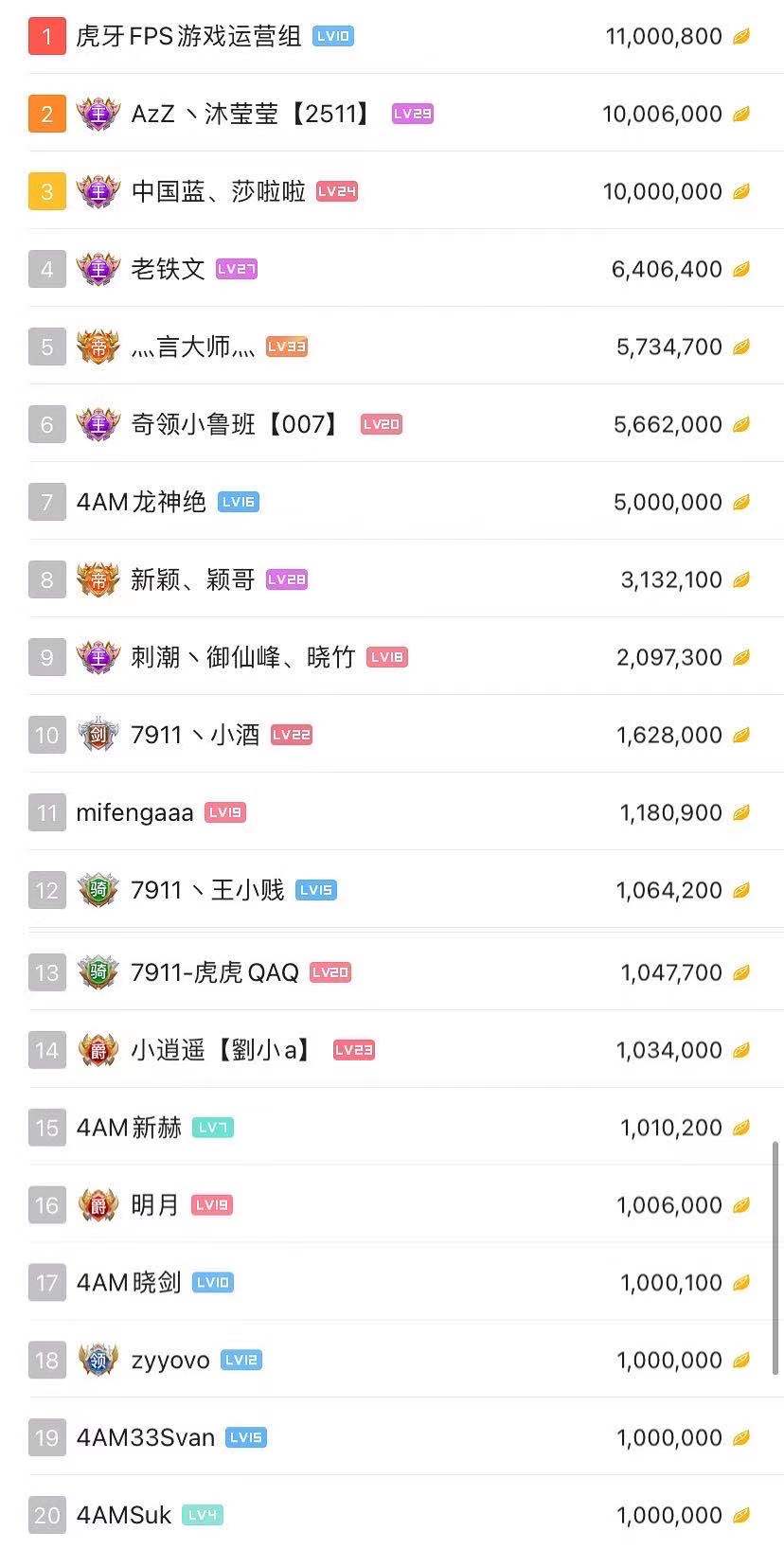 当然了韦神三周年怎么少得了送礼呢?之前就说过韦神是虎牙绝地求生的一哥,因此三周年之际,虎牙FPS运营组也是直接出面送出大礼霸占了韦神礼物行榜榜一的位置,此外像沐莹莹、莎啦啦、言大师、龙神绝等都榜上有名。在这里也不得不说一嘴4AM端游的兄弟了,都没有出现在榜单里,反观手游4兄弟齐刷刷送礼,这一波叫做《熟读职场》。