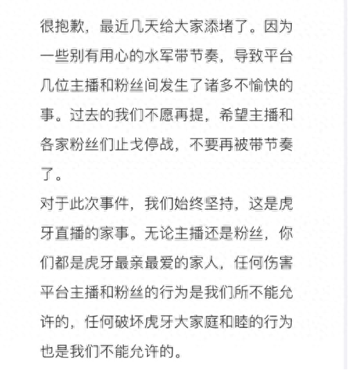 正如虎牙官博当日在微博中说的那样,“这是虎牙直播的家事”,“任何伤害平台主播和粉丝的行为是我们所不能允许的,任何破坏虎牙大家庭和睦的行为也是我们不能允许的。”