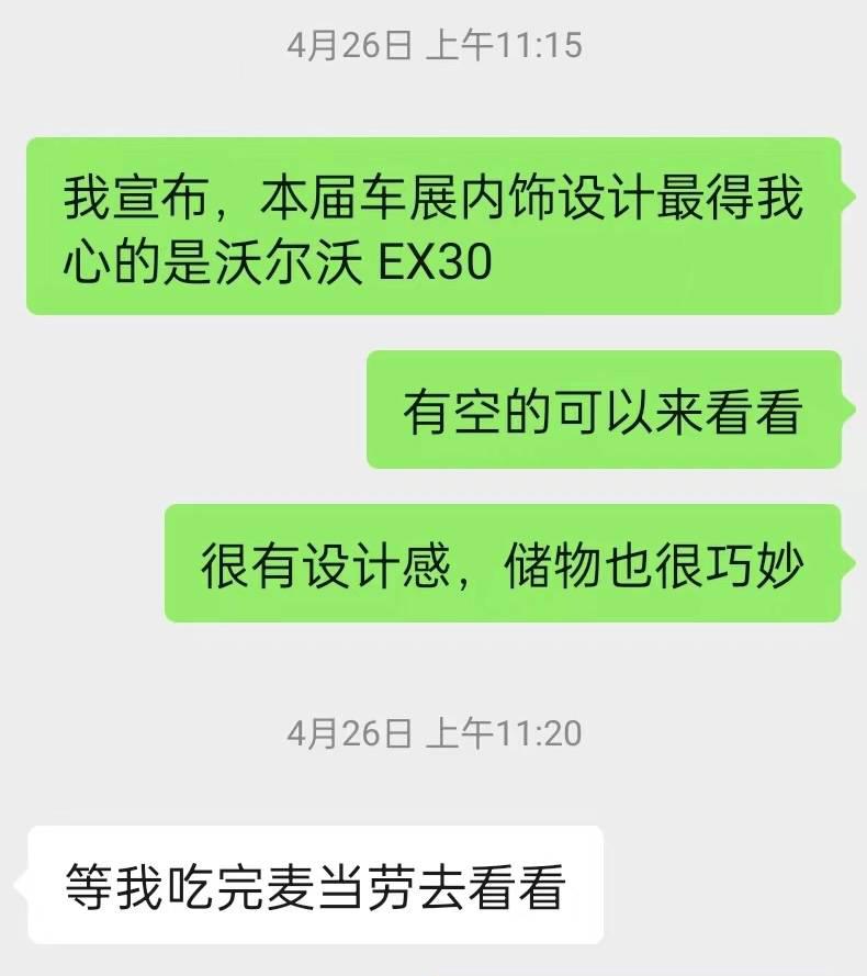 上午 11 点,来到展馆西侧 W3 馆的我,坐上了一辆沃尔沃 EX30。不为别的,单纯因为它好看。在随后的 15 分钟里,我从主驾挪到副驾,从后排翻到后备箱,最后在工作群里敲下了我的感受。