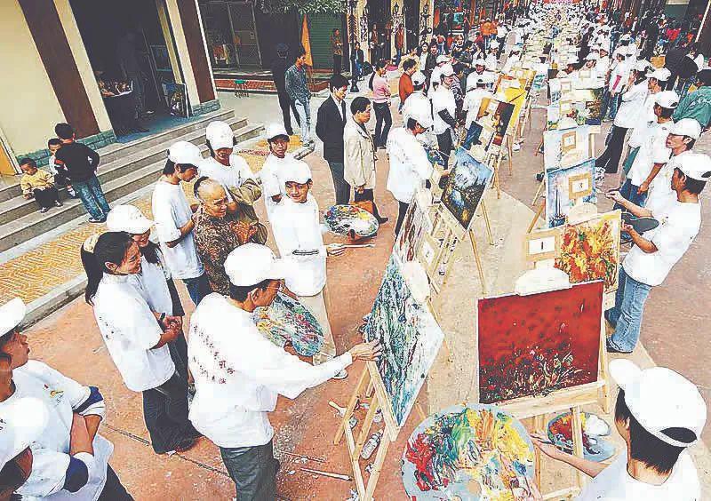 中国油画第一村大芬村的高光时刻,缘起于 2004 年首届深圳文博会。这一年 11 月 18 日,首届文博会大芬油画村分会场开幕,1000 名画工身穿统一的白色 T 恤,举行油画创作表演。