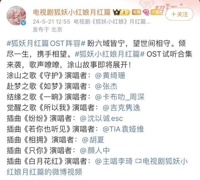 而《狐妖》从最初的定角到开机,几乎每一个动作都能登上热搜。最终,剧集选定的演员为:杨幂、龚俊、郭晓婷、魏哲鸣、祝绪丹、陈瑶、陈都灵、张凌赫⋯⋯他们都是炙手可热的古偶圈演员。《狐妖》配乐同样 " 星光璀璨 ",集结了黄绮珊、张杰、周深、吉克隽逸、袁娅维、胡夏、颜人中等人气歌手为自己演唱 OST(影视原声带)。