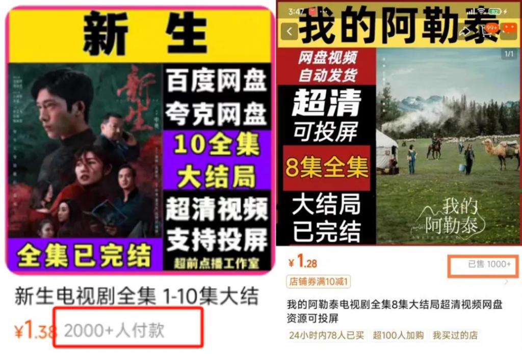 记者在一些电商平台上查询看到,有店铺的销售记录显示,售价 1.68 元的《庆余年 2》"24 小时内 400+ 人已买 "。截至 5 月 20 日,该店仅此剧就卖超 2000 单。同为这家店铺热卖资源的还有井柏然主演的《新生》、马伊琍主演的《我的阿勒泰》,销售数据分别为 2000+ 人付款、800+ 人付款。
