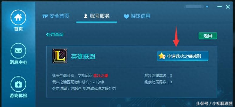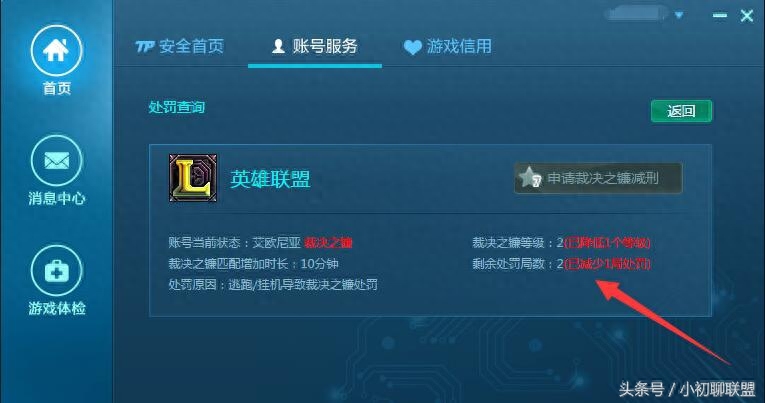申请成功后会降低1级玩家的裁决之镰等级,同时也减少一局被处罚的局数。