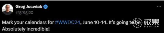 值得一提的是,苹果在首次官宣 WWDC24 时,就暗示了许多与 AI 相关的细节,苹果全球营销高级副总裁 Greg Joswiak 也在推文中,将 "Absolutely Incredible" 的首字母进行大写,几乎是明示将有 AI。因此,我们可以合理预测,AI 将是 WWDC24 的主旋律。