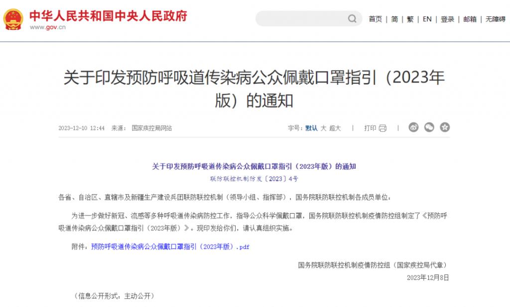 为进一步做好新冠、流感等多种呼吸道传染病防控工作,指导公众科学佩戴口罩,12 月 10 日,国务院联防联控机制疫情防控组制定了《预防呼吸道传染病公众佩戴口罩指引(2023 年版)》(以下简称《指引》)。