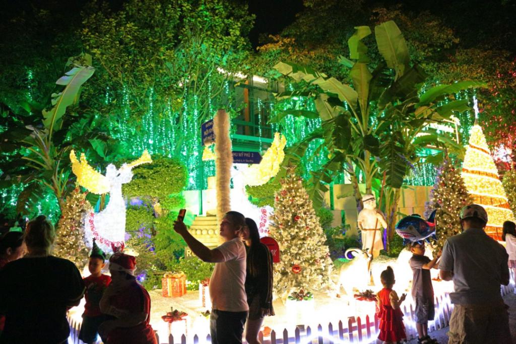 年末之际,胡志明市第七郡的 " 富人街 " ——富美兴街 ( Phú M H ng ) 变得熙熙攘攘,前来 " 打卡 " 的人们络绎不绝,因为这里的一系列价值百万美元的别墅都穿上了绚丽的 " 新衣 " 庆祝圣诞快乐,迎接新年