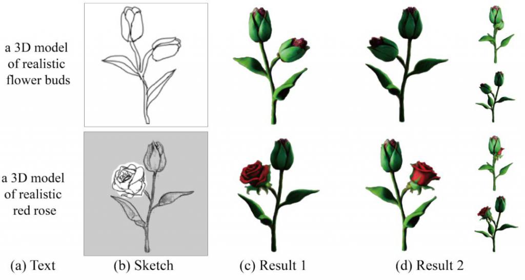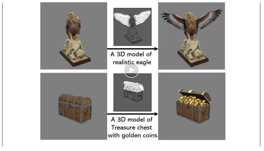 如图 6 所示,给定线稿和文本描述,该方法可以对应的三维模型。进一步,用户可以旋转到新的视角,对局部区域进行修改,实现三维模型的精细化定制。
