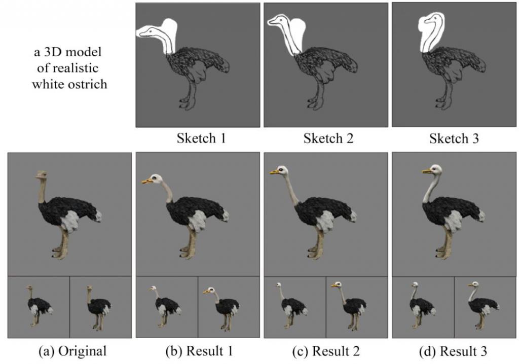 如图 7 所示,针对同一个三维模型,用户可以绘制不同的线稿,从而生成具备多样性的结果。线稿也实现了较为精细化的控制,实现了对鸵鸟不同颈部姿态的控制效果。