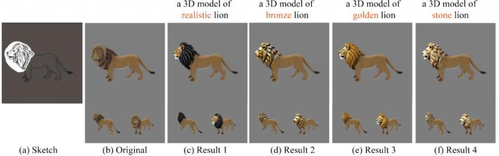 如图 8 所示,针对同一个三维模型,用户可以指定不同的文本,从而生成具备纹理多样性的结果。在给定相同线稿的情况下,可以生成黄金、铜制和石头质感的狮子头,并保持其他区域不变。
