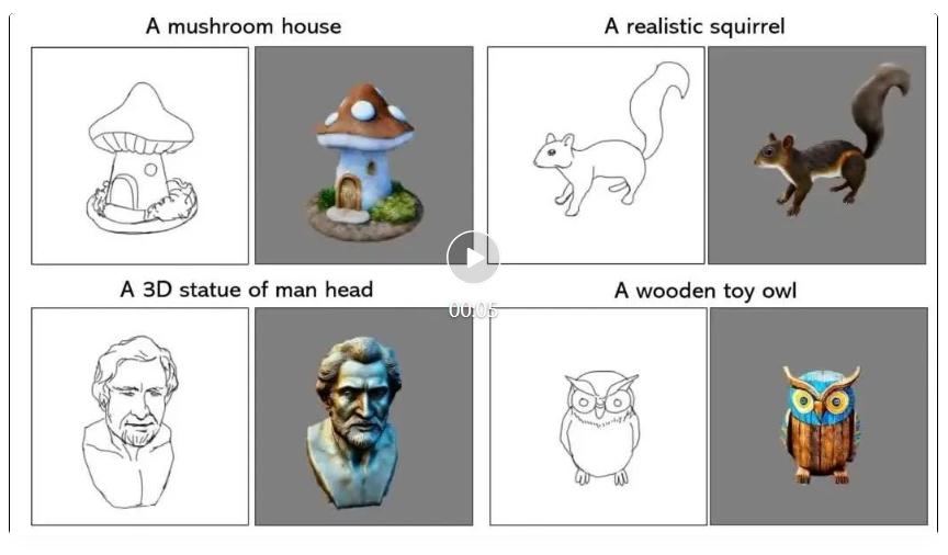 使用该系统,即使用户不会使用复杂的三维软件,也可以基于线稿自由创作三维内容,并对真实的模型进行修改和编辑。先来看看使用 SketchDream 创作的模型的效果: