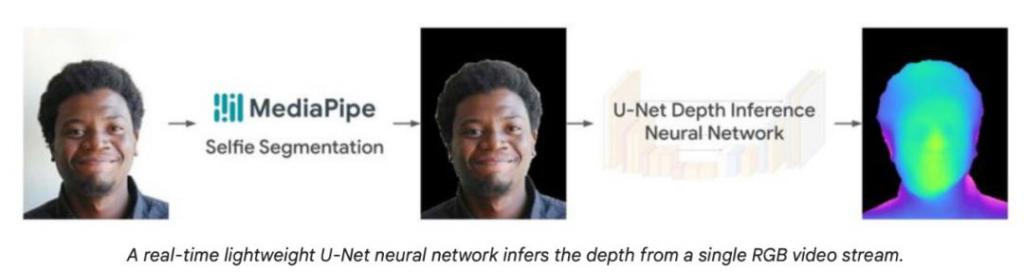 该 pipeline 从深度学习 ( DL ) 网络开始,利用该网络从实时 RGB 网络摄像头视频中推断深度。接着使用 MediaPipe 自拍分割模型分割前景,并将处理后的图像馈送到 U-Net 神经网络。