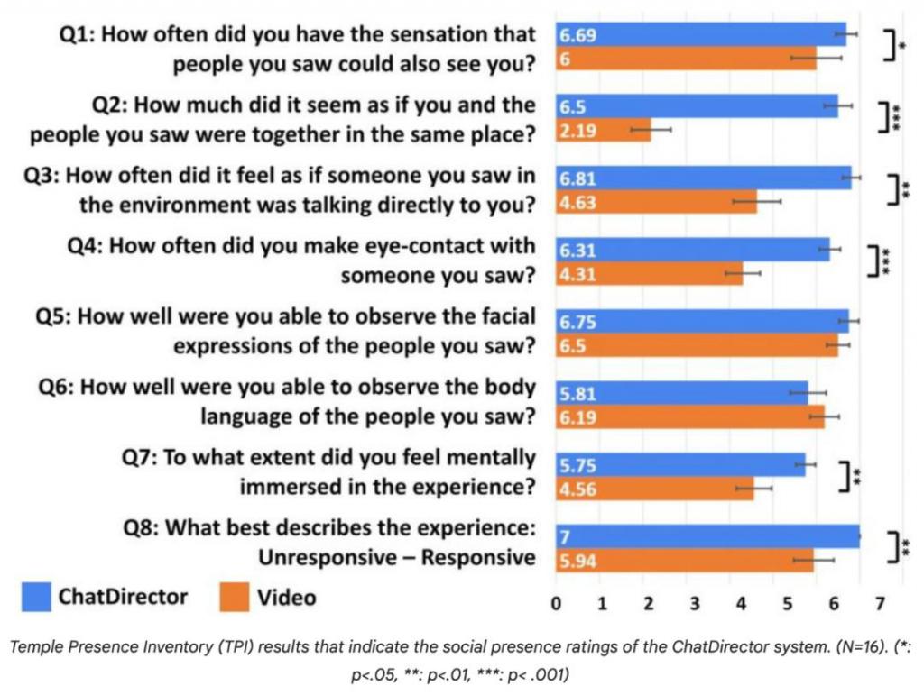 Temple Presence Inventory(TPI)结果显示了 ChatDirector 系统的社交存在评级(N=16)。( *:p<.05, **: p<.01, *** :p< .001)
