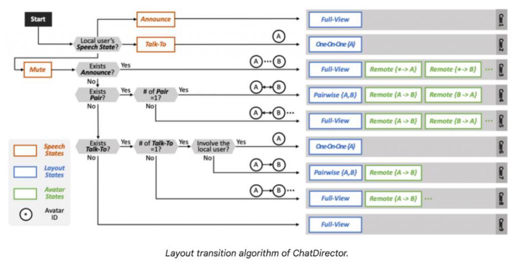 该算法根据正在进行的对话调整渲染场景的布局和化身的行为,允许用户通过接收自动视觉辅助来跟随这些对话,从而不需要在 DC4(最小化认知负荷)上额外浪费精力。