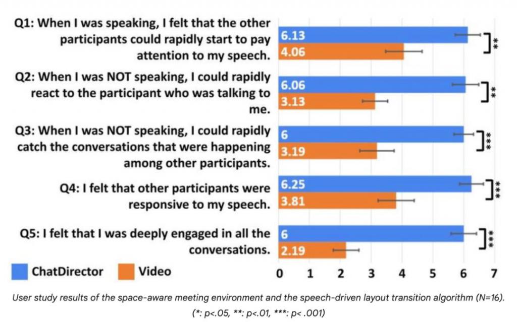 与作为基准的传统视频会议相比,研究发现 ChatDirector 显著改善了与语音处理相关的问题,这表现在用户对注意力转移辅助的积极评价上。