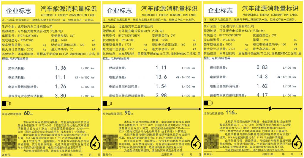 国内车企宣传产品续航时,通常会采用 CLTC 工况,包括比亚迪秦 L DM-i。因此我们可以看到,比亚迪秦 L DM-i 发布了纯电 80 公里、120 公里两种车型,但在工信部的标签中,纯电续航则分为 60 公里、90 公里、116 公里三个版本。该车最低电荷状态百公里油耗分别为 3.8L、3.98L、4.17L,这点能耗差别应该是来自车重的影响。