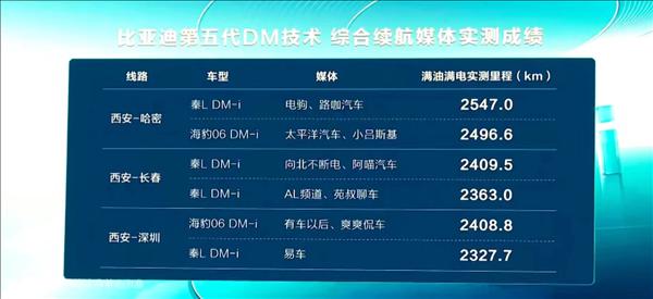秦 L DM-i 发布会上,比亚迪还公布了多个汽车媒体平台和博主实测的数据,全部都在 2300 公里以上,最高续航纪录甚至超过了 2500 公里,由此可见,比亚迪宣传整车续航 2100 公里属于反向虚标。