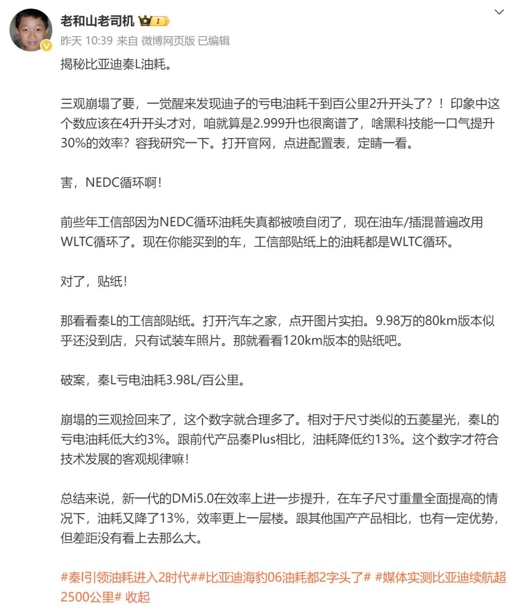 秦 L DM-i 发布后,汽车博主 @老和山老司机率先提出了质疑。他表示秦 L DM-i 的续航数据是 NEDC 工况,按照工信部贴纸信息,亏电油耗为 3.8L,相较于上一代 DM 技术能耗降低了 3%,比秦 PLUS DM-i 油耗低 13%。