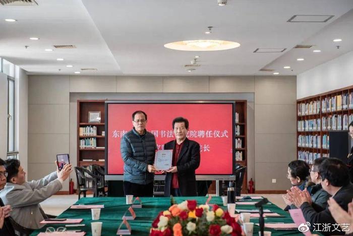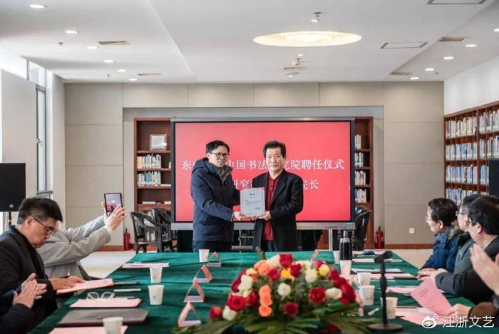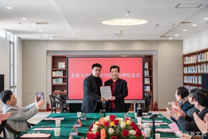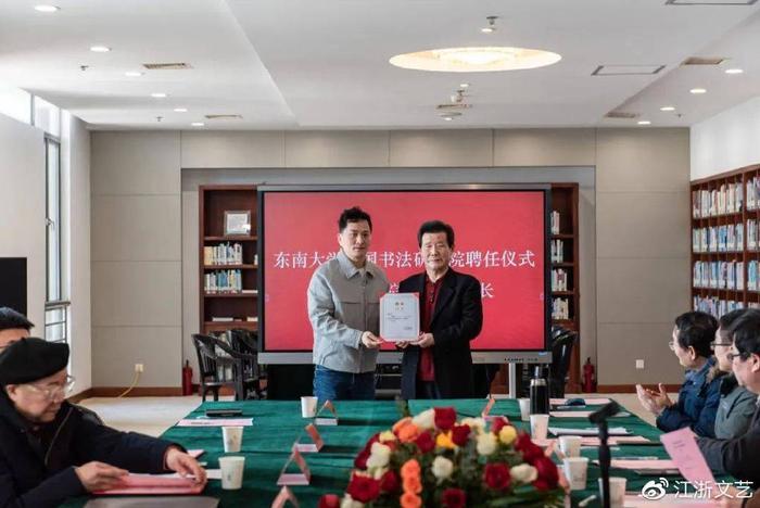 随后言恭达先生给东南大学中国书法研究院常务副院长朱敏,副院长李啸、徐习文,秘书长衡正安,副秘书长黄象明、郑长安等颁发聘书,并开展座谈交流。各位嘉宾也从各自的角度,讲述了言老师与东大深厚的渊源,以及对于重新激活中国书法研究院的期望。相信在言先生大力的支持、校领导的关怀与指导下,东南大学艺术学院和东南大学中国书法研究院将未来在更多领域携手共进,取得更好成绩。