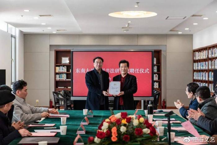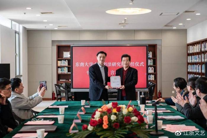 2023年2月27日,东南大学“言恭达奖励基金”捐赠仪式暨东南大学中国书法研究院聘任仪式在东南大学图书馆五楼会议室举行。东南大学党委常委、副校长黄大卫,东南大学党委常委、党委副书记、纪委书记高立国,东南大学发展委员会副主任、教育基金会秘书长芮振华,东南大学图书馆党总支书记孙莉玲,东南大学艺术学院党政班子,中国书法研究院院长言恭达及部分成员等出席本次仪式。仪式由东南大学艺术学院党委书记赵天为主持。