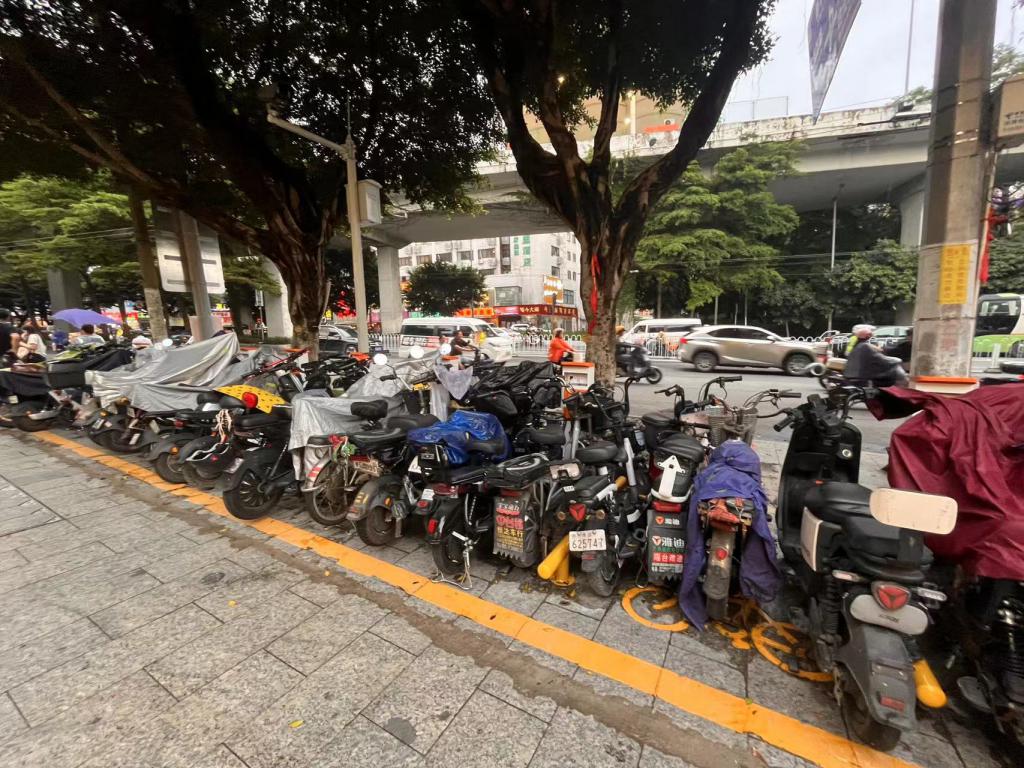下午 5 时 40 分,村外围的停车区已近停满,三元里经济联社的统计数据显示,村内电动车的保有量为 6000 余辆,如此庞大的车辆数目使得找停车位成为一大难题。