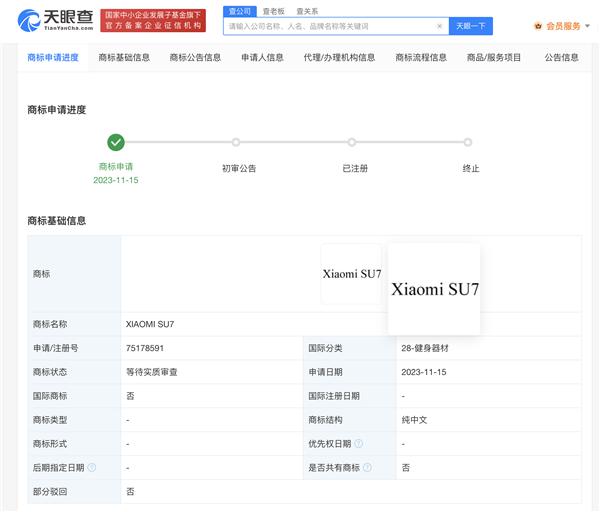 12 月 1 日消息,据天眼查网站显示,小米科技有限责任公司于 2023 年 11 月 15 日申请注册 "XIAOMI SU7" 商标,国际分类为健身器材,目前仍处于等待实质审查阶段。