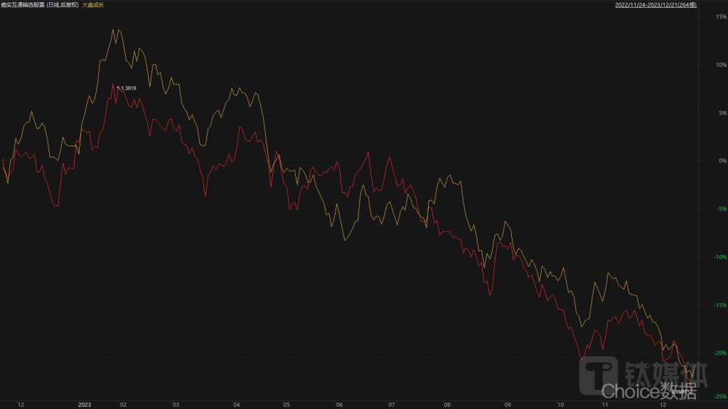 相似的情况也发生在杨欢入职嘉实基金以后的代表作嘉实互通精选股票与大盘成长之间。Choice 终端数据显示,近一年时间里,嘉实沪通精选股票录得跌幅 21.81%,大盘成长录得跌幅 22.13%;嘉实互通精选股票振幅 34.24%,大盘成长振幅 39.27%;嘉实互通精选股票最大回撤 30.55%,大盘成长最大回撤 32.42%,嘉实互通精选股票最大上涨 13.73%,大盘成长最大上涨 13.93%。从二者走势来看,嘉实沪通精选股票的净值始终围绕大盘成长指数波动。
