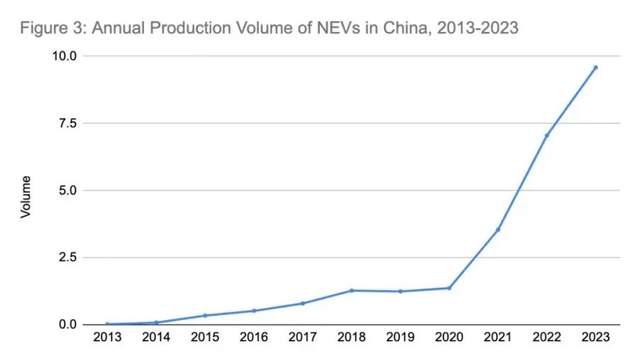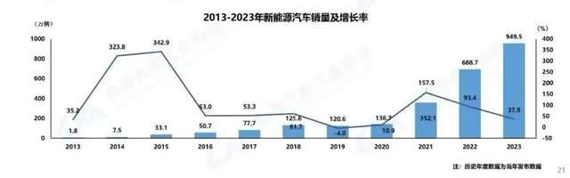 2010 年后,中国新能源汽车产量和销量大幅增长,并在 2020 年后呈现阶梯式的走高。2023 年,产量增至 958.7 万辆,销量为 949.5 万辆,产销基本持平。同时,新能源汽车的渗透率也呈同样的趋势,今年 4 月上半月批发、零售渗透率已双双突破 50%,2035 年的渗透率目标已提前 11 年完成。