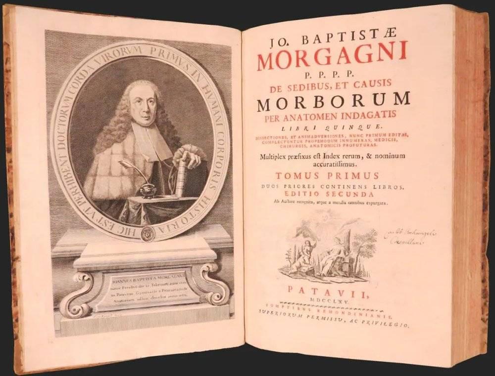 莫尔加尼 1761 年发表著作《疾病的位置与病因》用大量的实例,有说服力地证明症状与体内病变的关系(图:info.hsls.pitt)