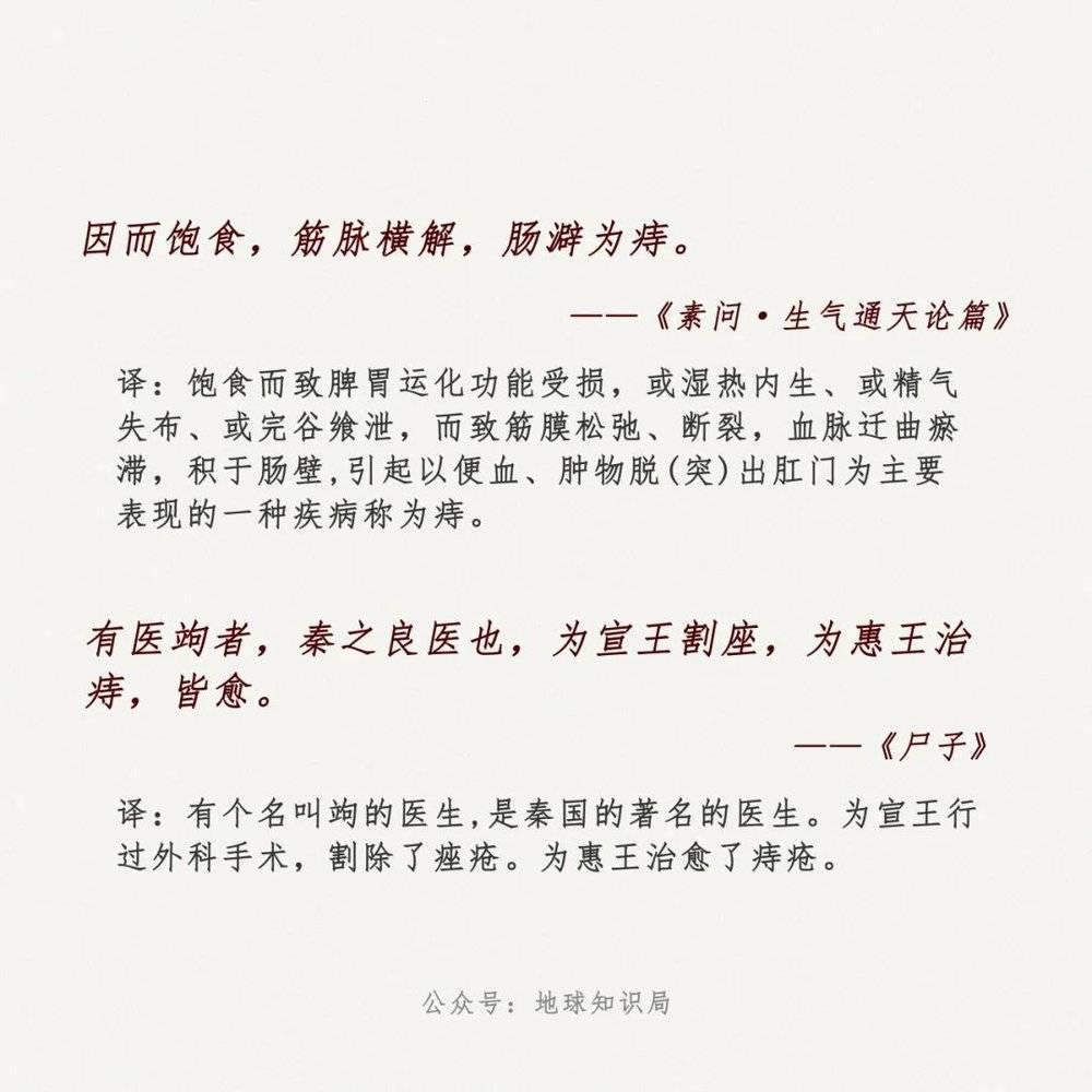 但很显然,古人不可能真的大范围推广依靠舔舐来治疗痔疮。先秦时期医学名著《素问 · 生气通天论篇》中提到了痔疮的成因:" 因而饱食,筋脉横解,肠澼为痔。"