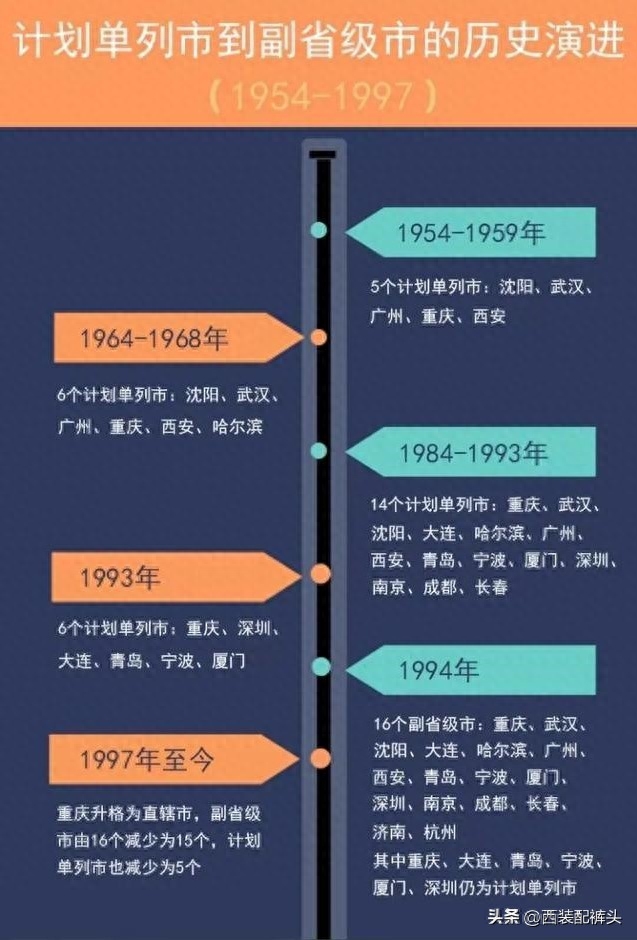 1997年,重庆升级为直辖市,副省级城市和计划单列市均减少了一个,最后就形成了现在15个副省级城市和5个计划单列市的格局。