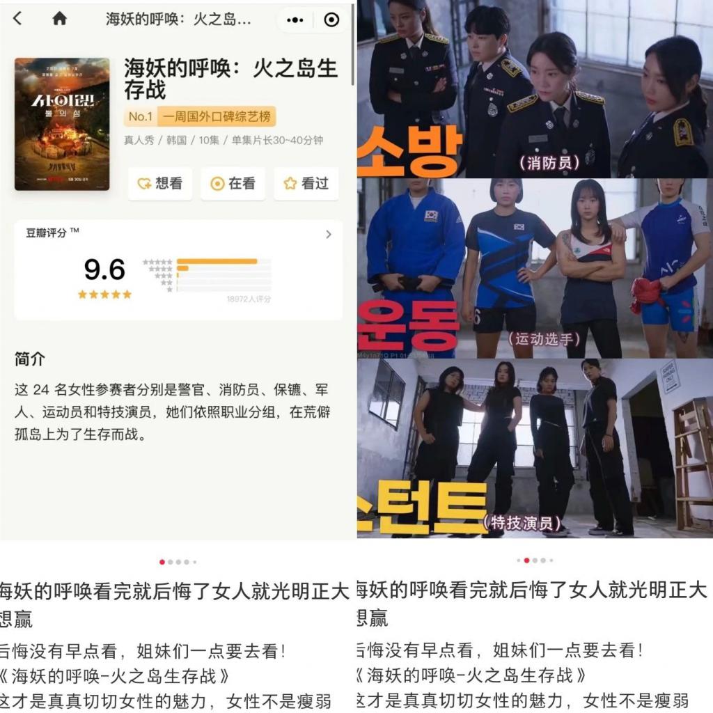 韩国综艺《海妖的呼唤:火之岛生存战》在豆瓣获得了 9.6 的高分,这是一档前所未有的强女综艺。