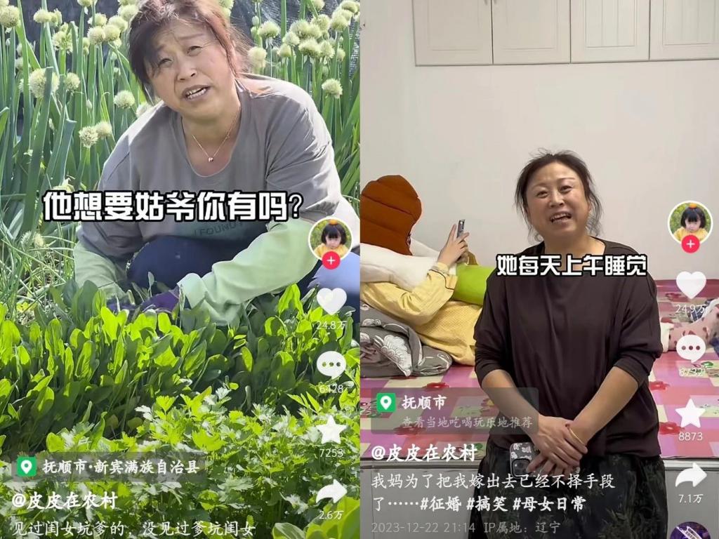 博主 " 皮皮在农村 " 视频中的东北妈妈似乎更接近我们的认知:顶着一头棕红或偏黄的卷发,身材壮实但与高大威猛还是有质的区别,刀子嘴豆腐心,干活儿利索嘴皮子更利索,心思灵敏逻辑自洽,骂人都能押上韵。