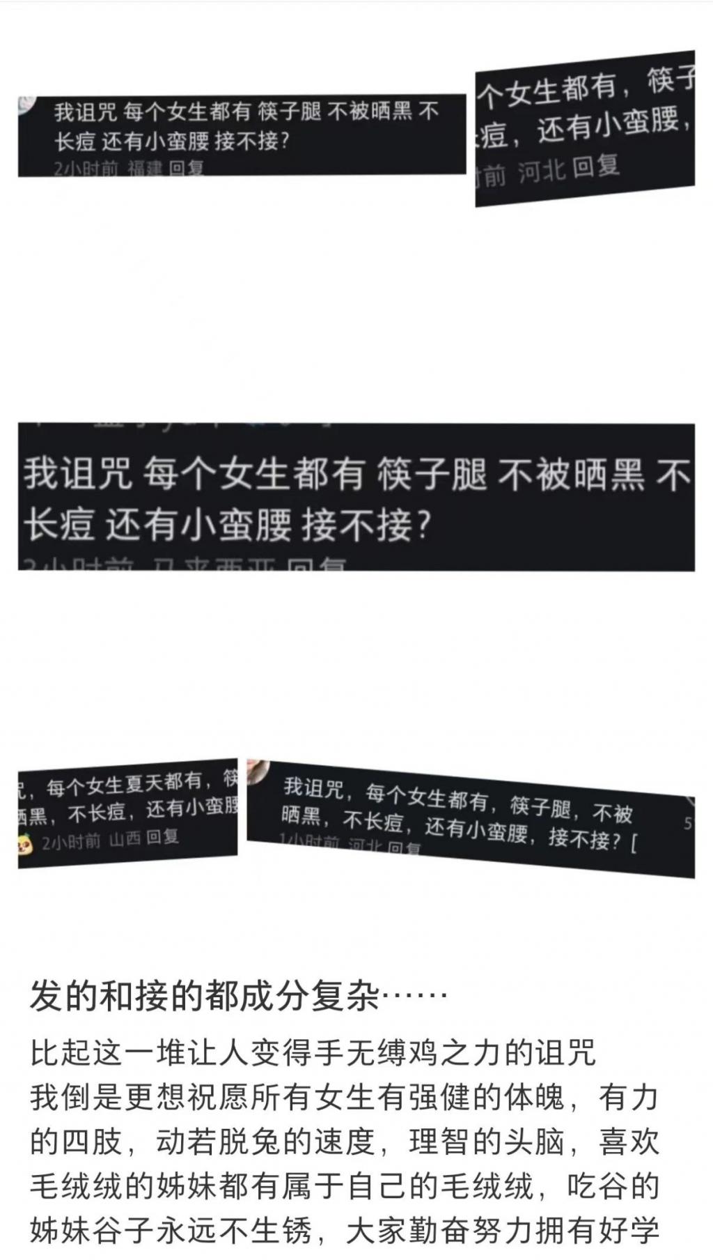 她为自己感到骄傲的地方是 " 他们能干的我也能干 ",而不是网上流传的 " 我诅咒每个女生都有筷子腿、漫画手、天鹅颈、大长腿,黄黑皮变冷白皮,接不接?"