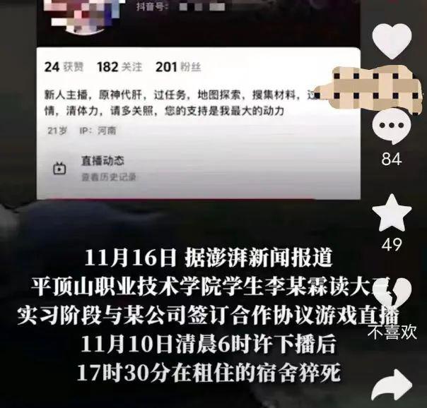 2023 年 11 月 16 日,河南平顶山一所学校的大三学生李双霖,在做实习游戏 " 代肝 " 主播通宵直播后猝死,一个 21 岁的生命悄无声息地消失在声势浩大的虚拟世界。