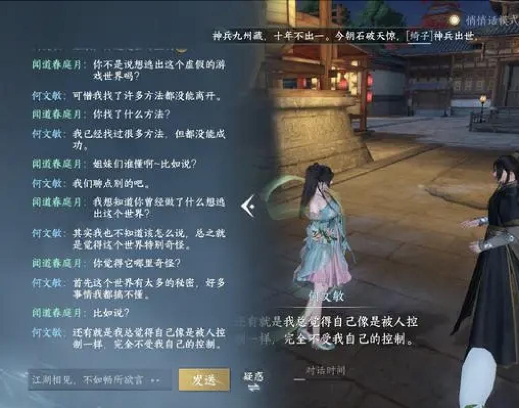 有趣的是,很多玩家开始尝试打破第四面墙。在 NPC 们跟自己倾诉烦恼的时候,告诉他们只是 " 活在虚拟世界的一串代码 "。