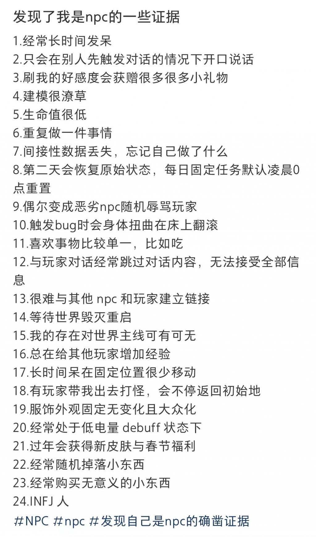 调侃之余,不少网友还在网络平台上发布了确认自己是 NPC 的多个评价标准。看过后,不少网友戏称 " 我正式被确诊为 NPC 了 "。