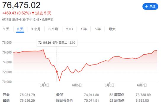 然而,6 月 5 日,虽然总理莫迪的印人党无法凭一己之力占据议会多数席位,但关键盟友已承诺留在执政联盟之中。受此消息影响,SENSEX 指数与 NIFTY 指数大涨且涨势延续。6 月 7 日,印度 SENSEX 指数收复本周二的全部跌幅,并创下纪录新高。