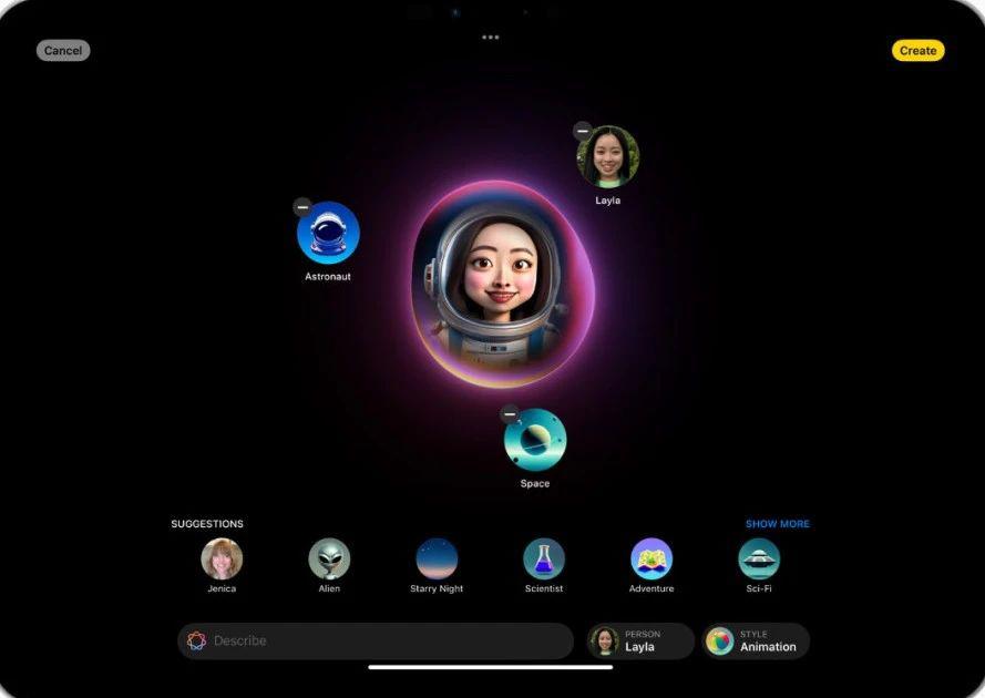 一是生成表情包和图片。当用户找不到合适的表情符号来表达自己想要表达的意思时,可以通过自然语言自由创建自己的表情符号。而且,还可以在跟朋友发消息时,用朋友的照片生成不同风格的图片,让聊天更加有趣,目前支持素描、插图和动画三种风格的图片生成。