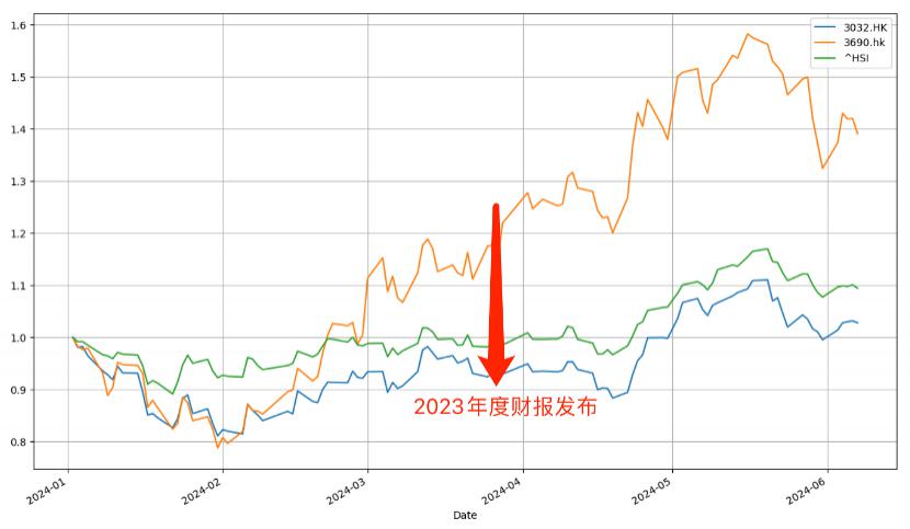 我们首先整理了 2024 年初至今美团,恒生指数以及恒生科技指数的走势情况。2024 年 Q1 三条折线保持了高度的相关性,三月下旬之后美团股价抖升,与大盘逐渐拉开距离。